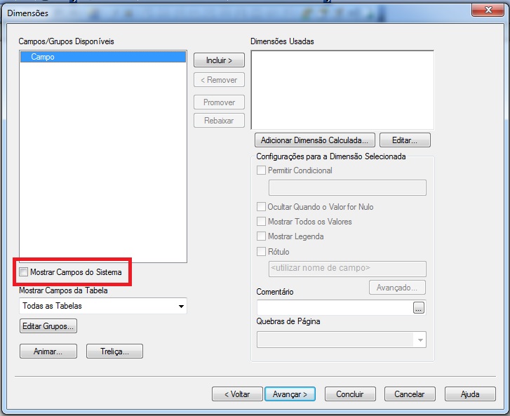 Observação: Os campos de sistema podem ser visualizados pelo usuário desenvolvedor habilitando o checkbox “Mostrar campos do sistema” nas telas de Dimensões, expressões e lista de campos. Abaixo mostro onde encontrar essas opções em cada uma das telas: