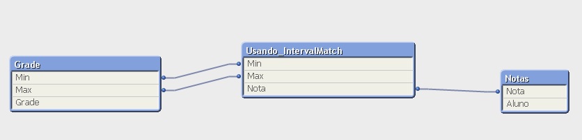 Ele deve ser colocado antes do Load ou declaração de Select (SQL) que carrega os intervalos. O campo que contém os pontos de dados discretos (Notas no exemplo abaixo) já deve ter sido carregado no QlikView antes do comando com o prefixo IntervalMatch. O prefixo não lê esse campo a partir da tabela da base de dados. O prefixo transforma a tabela carregada de intervalos em uma tabela que contém uma coluna adicional: os pontos de dados numéricos discretos Ele também expande o número de registros de forma que a nova tabela tenha um registro por combinação possível de ponto de dados discreto e intervalo.
