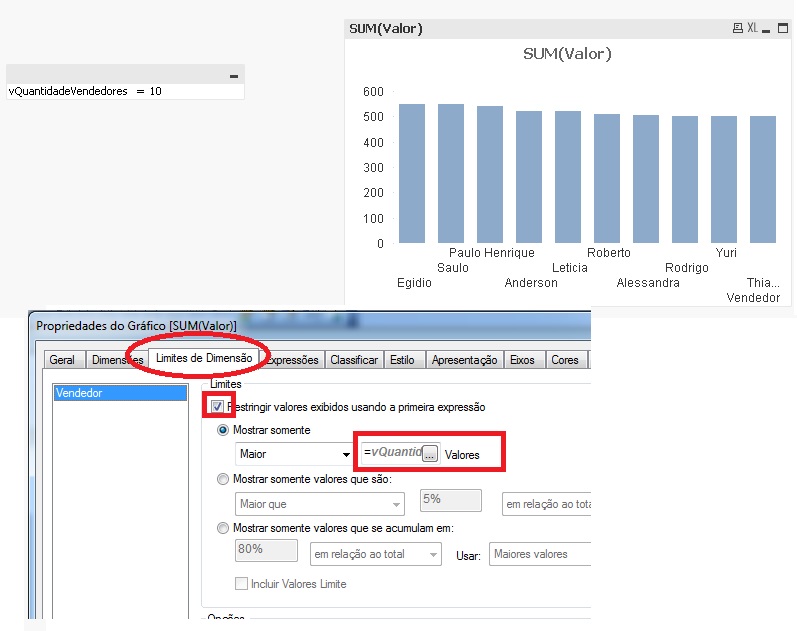 Gráfico com a delimitação da quantidade de vendedores através da variável vQuantidadeVendedores. Por se tratar de um número simples, sua utilização não necessita da expansão do sinal de dólar. Veja exemplo: