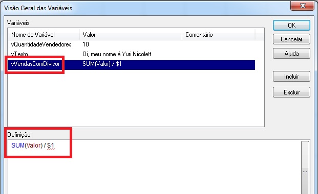 A variável que iremos criar é chamada de vVendasComDivisor e o seu conteúdo deve ser: SUM(Valor) / $1