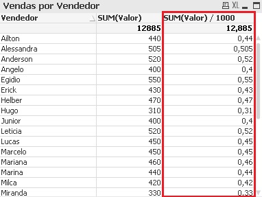 Repare que a coluna a esquerda é o valor original de vendas e a outra é o resultado das vendas dividido por 1000.