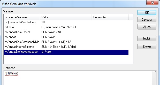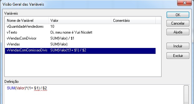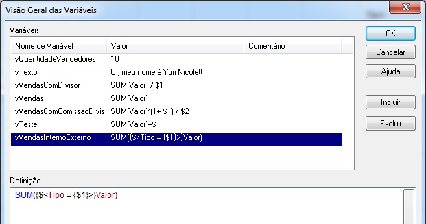 IMPORTANTE: Sempre que criar uma variável e seu conteúdo for o de uma expressão, não se deve usar o sinal de igual na frente, pois queremos que essa variável seja interpretada dentro do gráfico que a utilizarmos, caso contrário essa variável será recalculada para todos os filtros que o usuário fizer, mesmo que ela não esteja sendo utilizada naquele momento. Depois criarei um post para falar disso 🙂