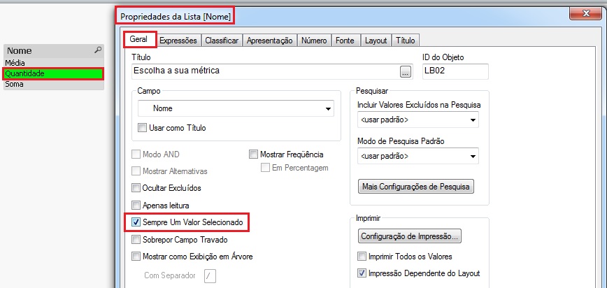 Note que a opção “Sempre um valor selecionar” é habilitada somente após esta lista possuir apenas um campo selecionado.