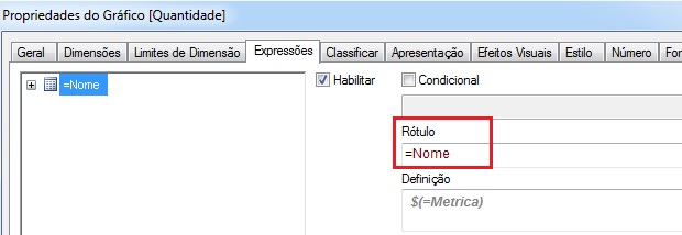 OBSERVAÇÃO: O sinal de igual é obrigatório para que o QlikView compreenda que ele deve avaliar o conteúdo do campo Métrica e o resultado dessa avaliação deverá ser tratado como algo que ainda precisará ser avaliado.