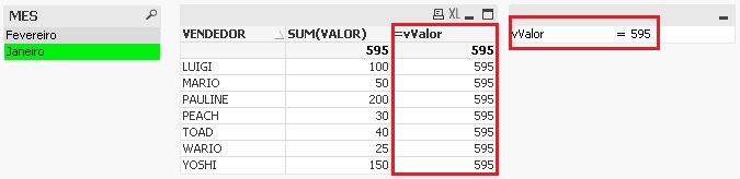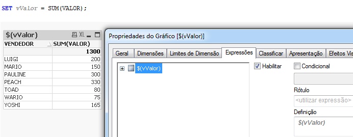 O valor de 1300 se refere ao valor total de vendas de todos os vendedores. Ele se repete, pois diferente de quando criamos a variável sem usar o sinal de igual, a expressão “SUM(VALOR)” já foi avaliada/executada pelo QlikView antes de ser chamada no gráfico. Em outras palavras o número vem pronto.