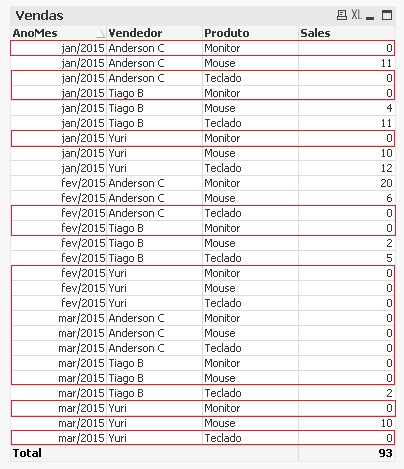 Neste exemplo temos uma tabela fato que possui as informações de Vendas por AnoMes, Vendedor e Produto. Quero montar uma tabela que exiba todas as vendas e também o que não foi vendido para conseguir responder algumas perguntas, como por exemplo: Quais os produtos que determinado vendedor não vendeu? Quando? Quais meses ficou sem vender?