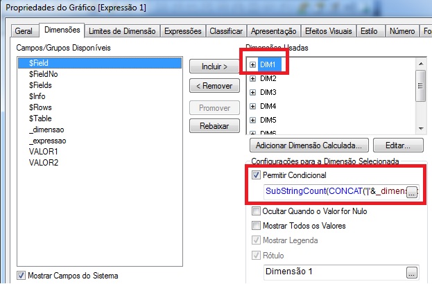 Condição a ser preenchida: SubStringCount(CONCAT(‘|’&_dimensao,’|’) & ‘|’, ‘|Dimensão1|’)